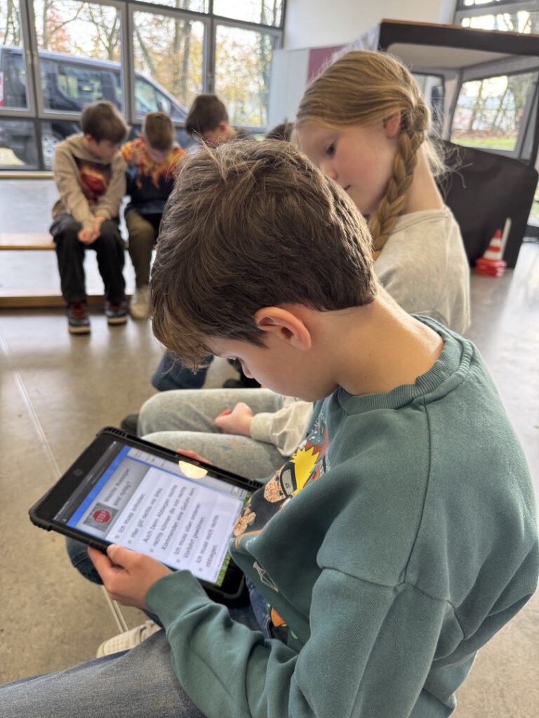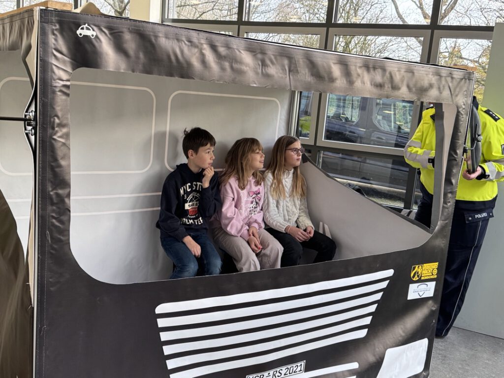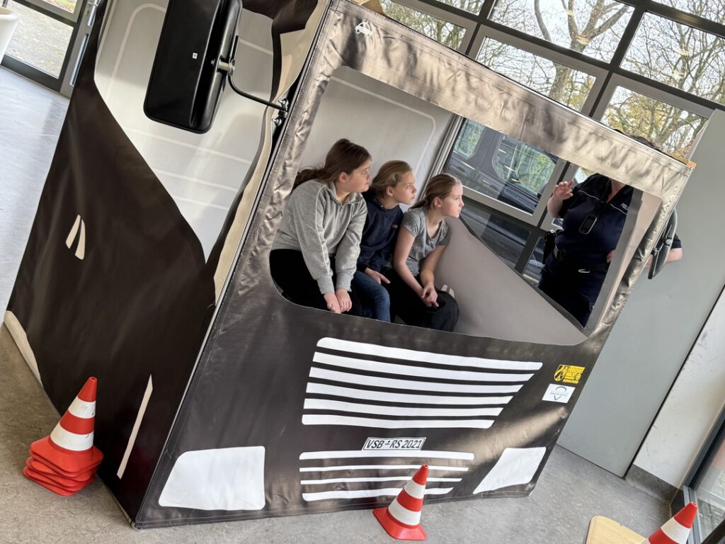 Um den Kindern diese Gefahren zu verdeutlichen, wurde u.a. eine Fahrerkabine nachgebaut. In dieser Kabine können Kinder, zusammen mit Frau Monse und Frau Wallat, den Blick aus den Augen eines Fahrzeugführers modellhaft erleben und sich den „Toten Winkel“ selbst erarbeiten. Kaum zu glauben, aber hierbei verschwindet die komplette eigene Schulklasse im toten Winkel. Dabei wird den Schülerinnen und Schülern deutlich gemacht, dass der LKW-Fahrer, auch wenn er wollte, beim Abbiegen nicht alles im Blick haben kann.