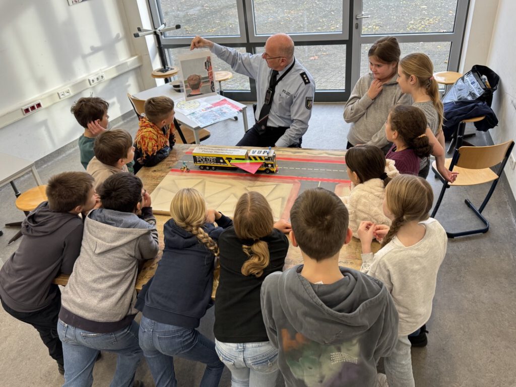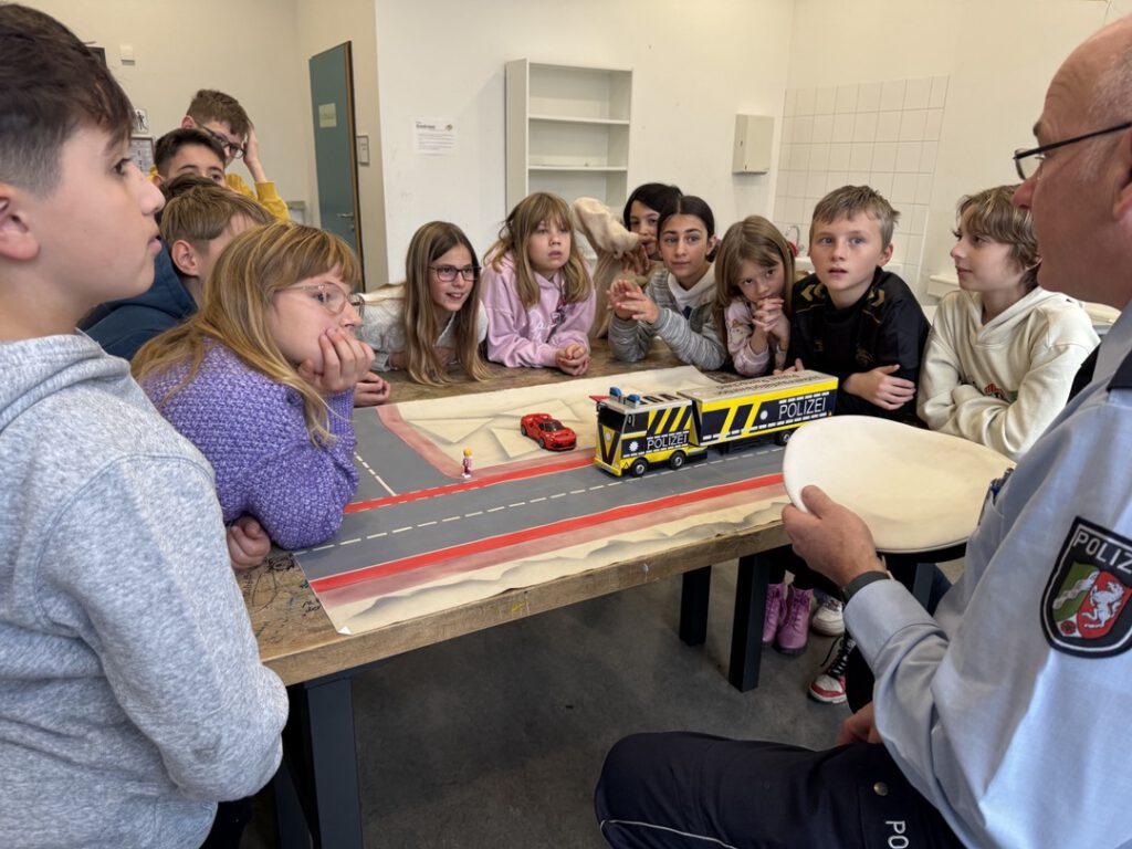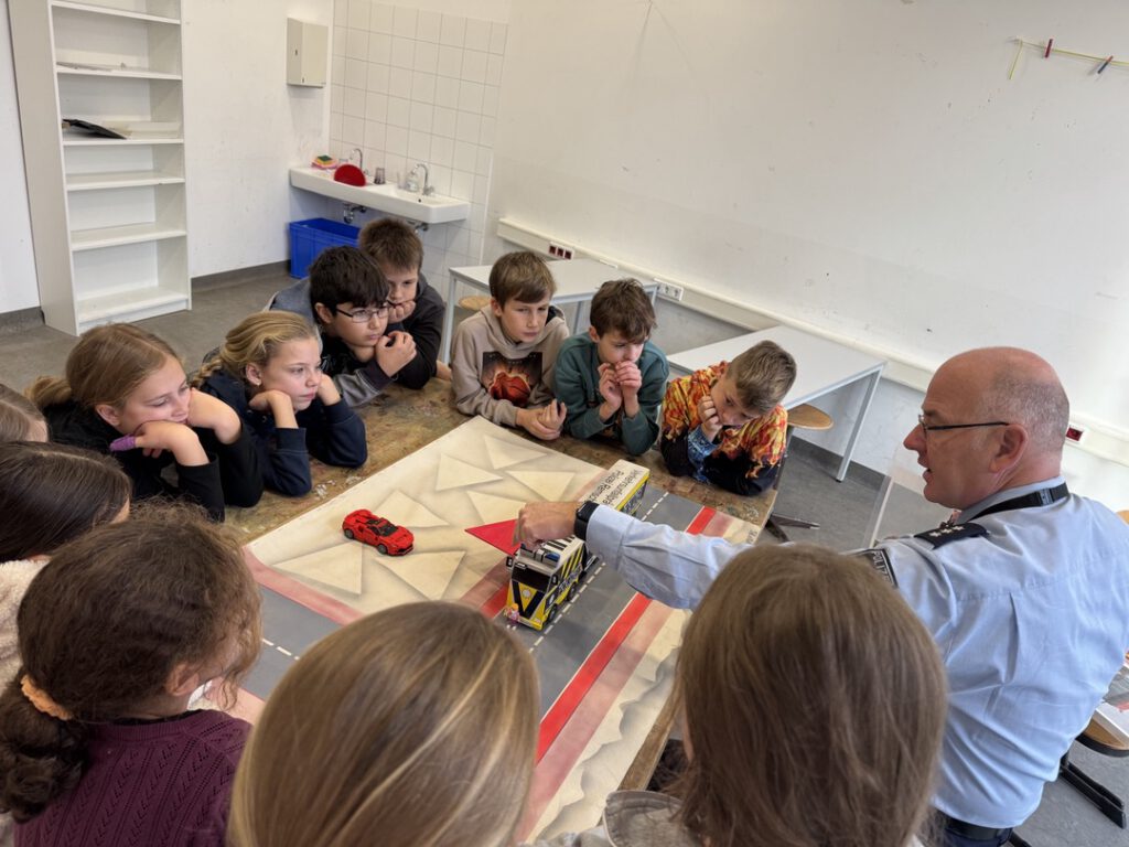 Die veränderte Sicht eines Lkw- Fahrers im Spiegel während eines Abbiegevorgangs wurde den Kindern der Jahrgangsstufe 5 eindringlich durch ein Modell-Lkw verdeutlicht. Herr Wenner erläuterte wie sich der Sichtbereich im Spiegel zur Fahrzeugseite hinbewegt, so dass Fahrradfahrer und Fußgänger aus diesem verschwinden und für den LKW-Fahrer nicht nachvollziehbar ist, ob andere Verkehrsteilnehmer in der Nähe sind.