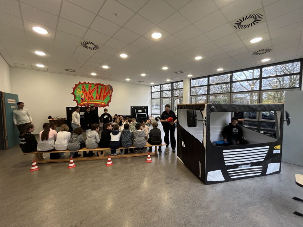 Frau Monse, Frau Wallat und Herr Wenner von der Verkehrsunfallprävention der Polizei Remscheid haben auch dieses Schuljahr mit unseren neuen 5. Klassen das Verkehrsunfallpräventionsprojekt „Mit dem Brummi ins Klassenzimmer“ durchgeführt und dafür ihren selbstentworfenen „Brummi“ im Neubau aufgebaut.
