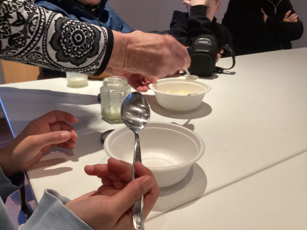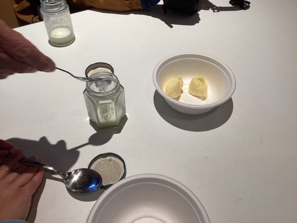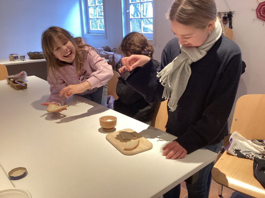 All das durften die Kids der 5d vor Ort ausprobieren! Sahne wurde in Marmeladengläser gefüllt, dann von Hand so lange gerüttelt, bis die Sahne zu klumpen begann und dann schließlich zu Butter wird. Danach durften sie die Butter auf Stullen mit Salz streichen und probieren. So mancher Schüler, der zuerst skeptisch war oder sogar meinte, er habe eine Butterallergie, fand die selbst geschlagene Butter richtig lecker und es blieb nicht bei einem Stück Brot.