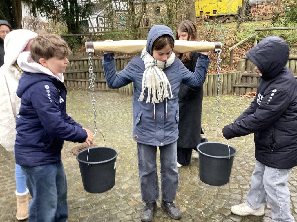 Auch auf die Gruppe der Kinder warteten spannende Aufgaben: so erfuhren sie beispielsweise, dass die Schulkinder manchmal mehr als zwei Stunden zu Fuß zur nächsten Schule unterwegs waren. Um sich den Schulweg ein wenig interessanter zu gestalten, lernten sie zu Kaiser Wilhelms Geburtstag ein Gedicht auswendig. Wenn sie aus der Schule wieder zuhause ankamen, mussten sie ihrer Mutter zur Hand gehen und entweder Wasser vom Brunnen schöpfen und nach Hause tragen oder aber Butter schlagen.