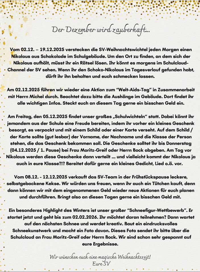 Die SV plant jedes Jahr so viele tolle Aktionen. Und besonders in der Adventszeit sind sie sehr aktiv, um allen Schülerinnen und Schülern eine Freude zu bereiten. Und das ist allen Mitgliedern der SV wieder ganz wundervoll gelungen. Danke, an unsere tolle SV!!!