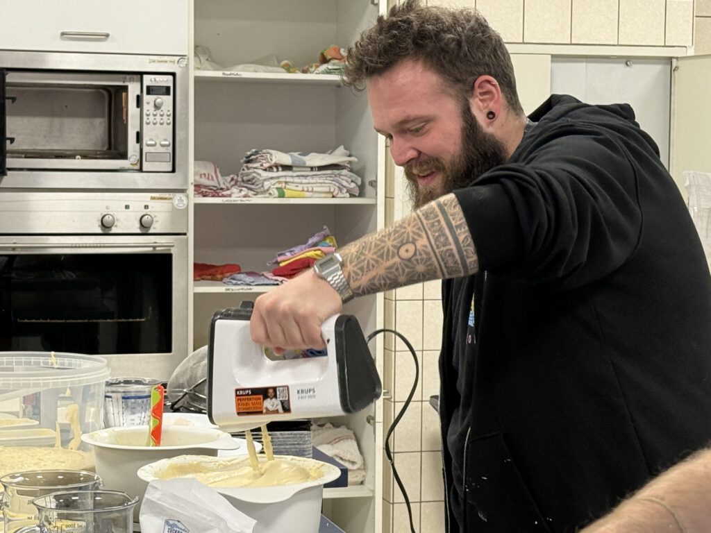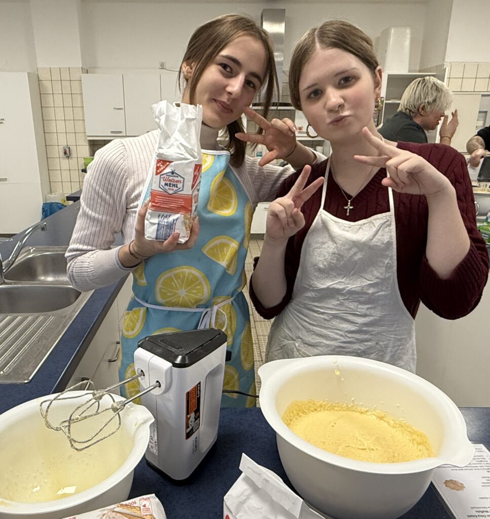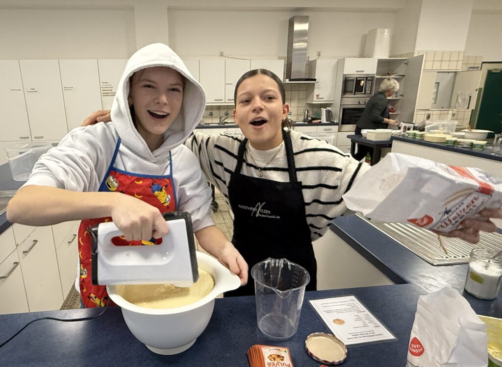 Bereits am Donnerstag bereiteten die Talia (10e), Alexa (10e), Emily (10e), und Lila (10c), gemeinsam mit Frau Förster, Herrn Mertens, Frau Schermer und Herrn Michels den Kuchenteig vor. Mit grooviger Musik fiel das Rühren der großen Teigmenge leichter und machte viel Spaß. Talia erzählt: „Ich backe gerne und deshalb helfe ich mit. Zudem kommt der Erlös auch meinem Cambridge Zertifikat zugute.“