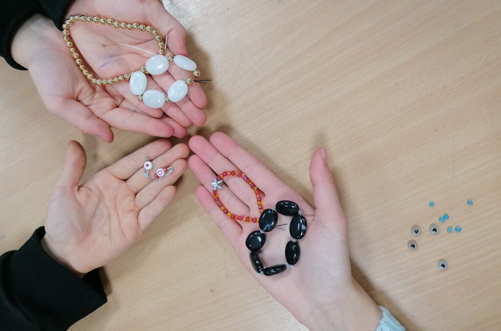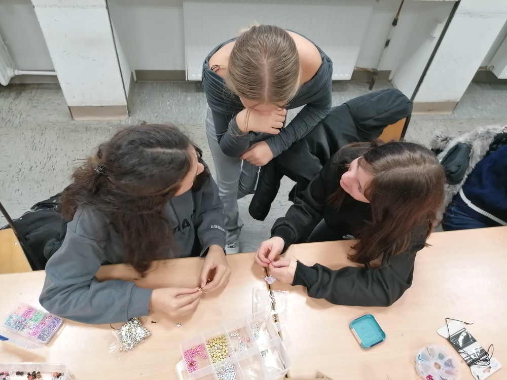 Unter der Leitung von Frau Harrs kommen wöchentlich 15 Mädchen aus allen 6. Klassen zusammen und basteln gemeinsamen Schmuck, wie zum Beispiel Armbänder, kleine Perlenanstecknadeln oder Ohrringe.
