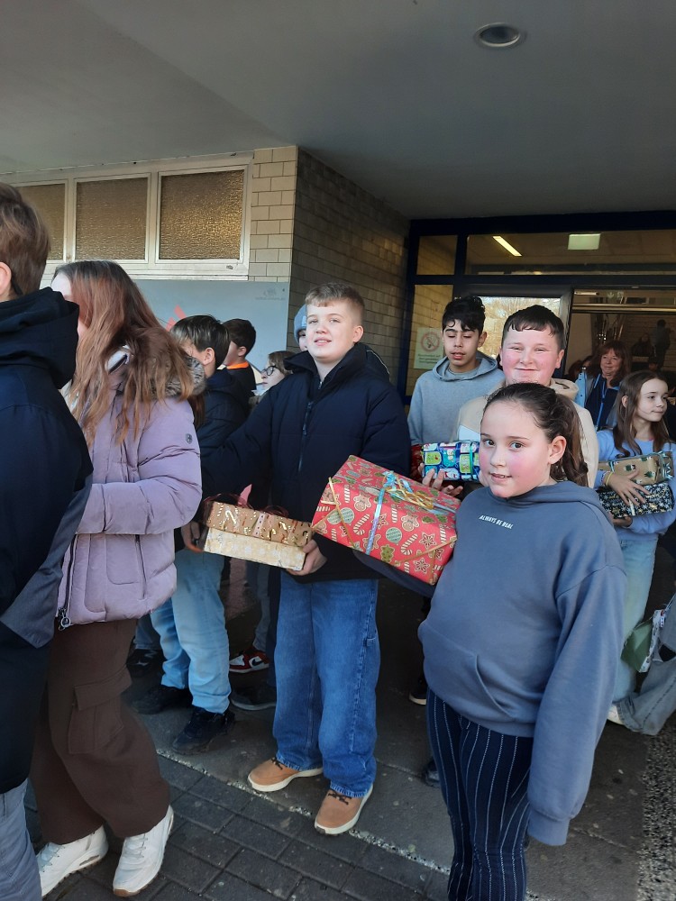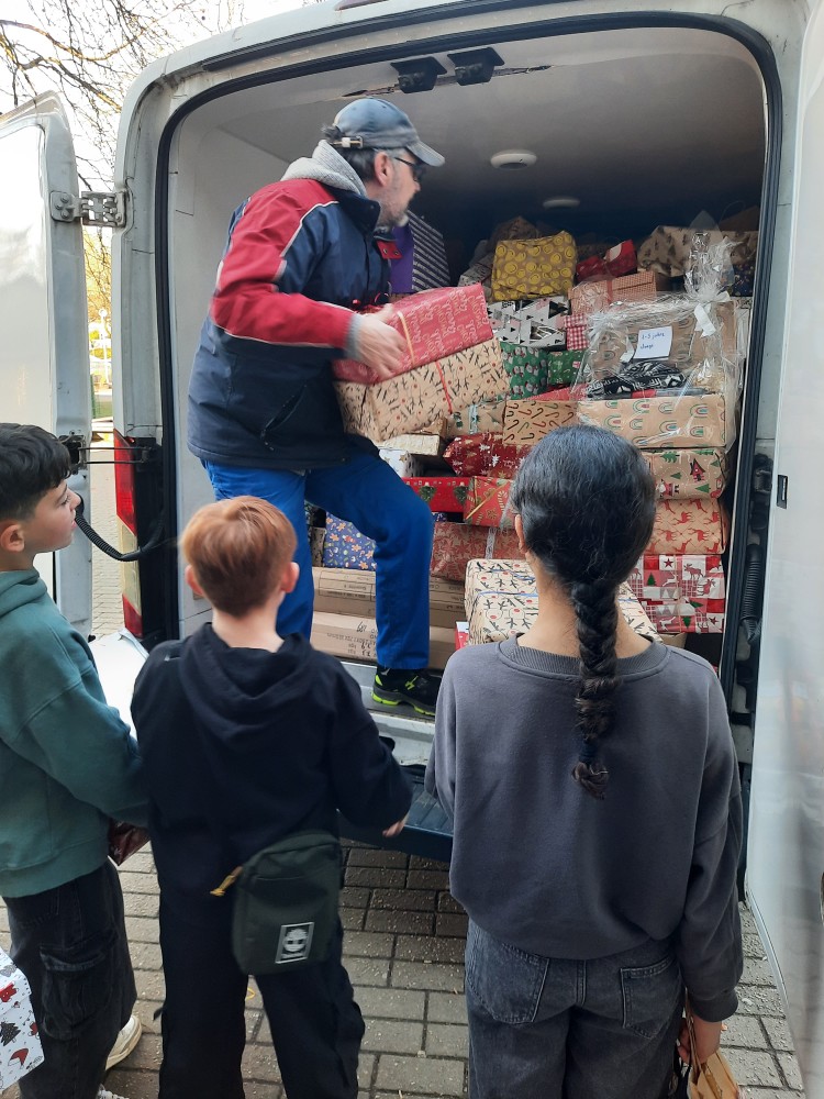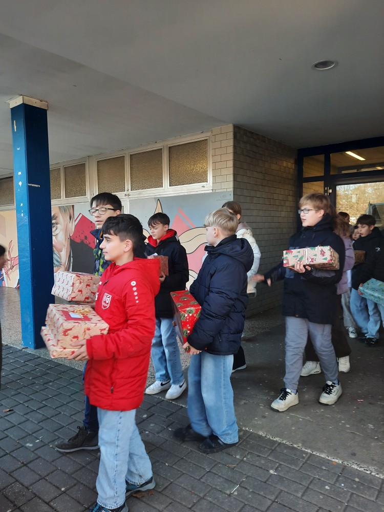 Betreut wurde die Aktion an unserer Schule von Frau Harrs und Frau Brauer. Am Montag, dem 15. Dezember, wurden insgesamt 66 Weihnachtspäckchen von Herrn Wessel, einem Vertreter der Remscheider Tafel, bei uns an der Schule abgeholt. Bei der Übergabe unterstützten die Klassen 5b und 6d tatkräftig. Die Päckchen wurden von Schülerinnen und Schülern, Lehrerinnen und Lehrern sowie Eltern und weiteren Mitgliedern der Schulgemeinschaft gespendet.
