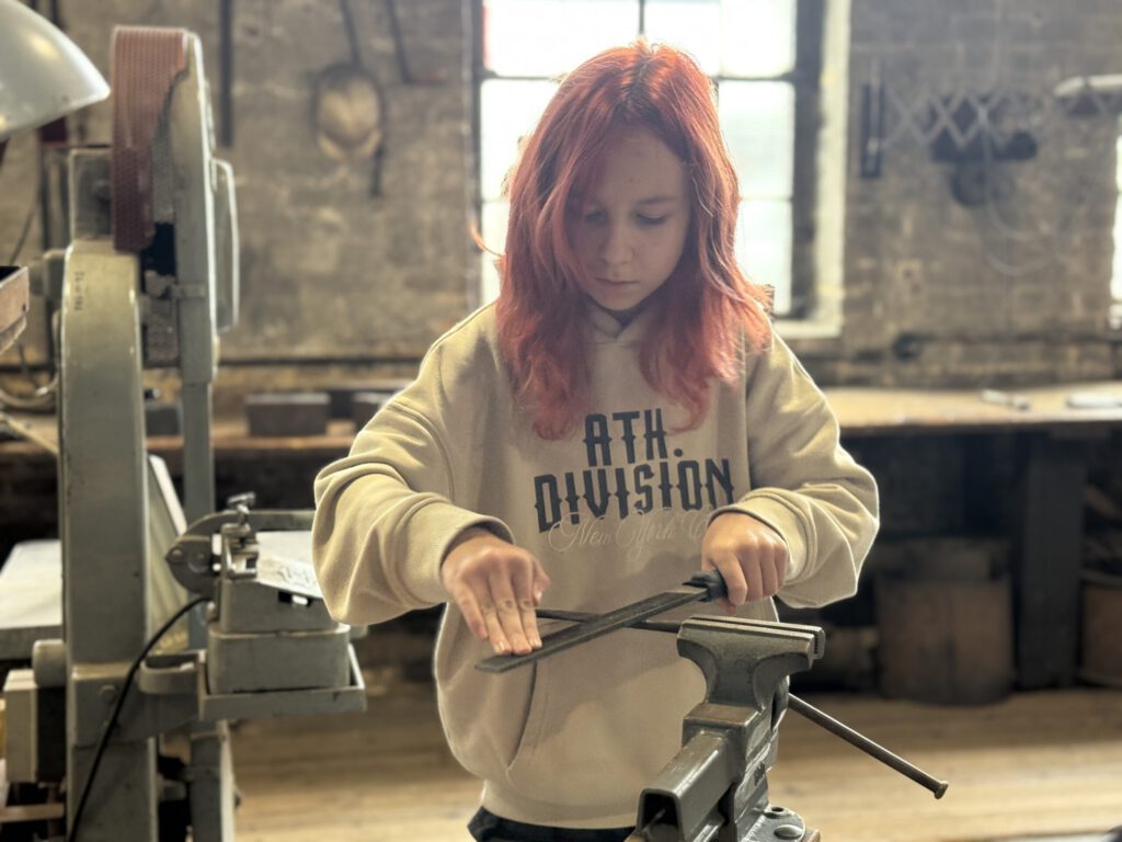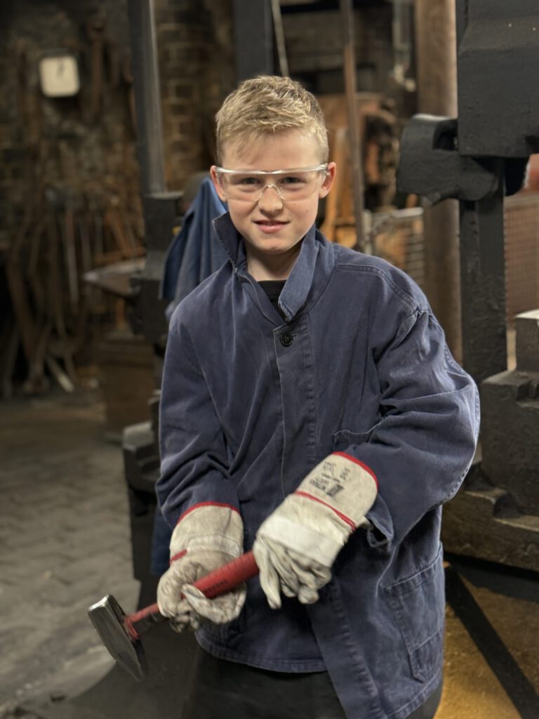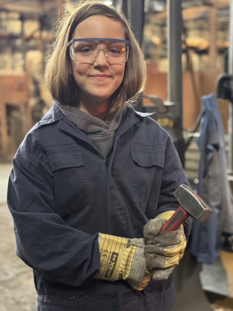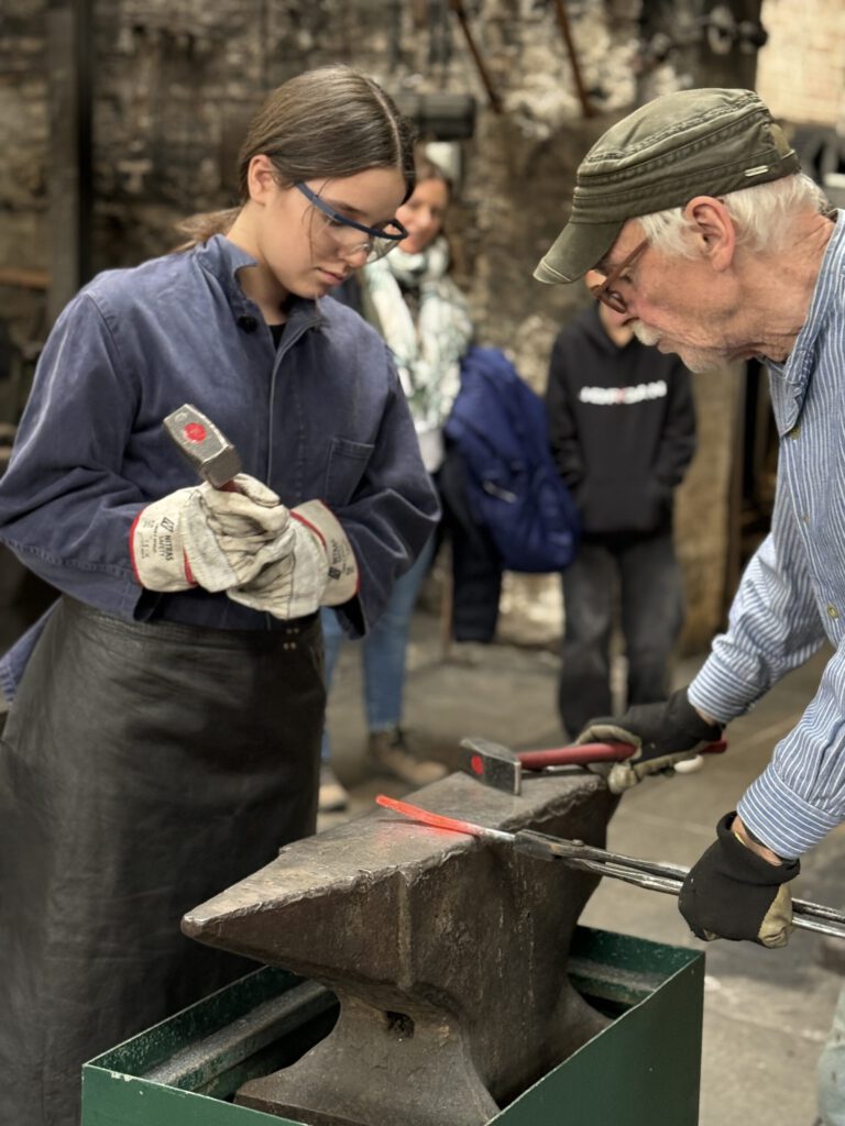 Zuerst mussten sich die Schülerinnen und Schüler Schutzkleidung anziehen: eine Arbeitsjacke, eine Lederschürze, Handschuhe und eine Schutzbrille. Und dann ging’s los. Sie lernten das dosierte gleichmäßige Schlagen mit dem Hammer auf den Amboss und versuchten ihre Schläge ausdauernd und konzentriert einzusetzen. Das war nicht so leicht, aber alle versuchten ihr Bestes zu geben. Ziel war es, dass jede Schülerin und jeder Schüler aus einem Stahlstab, der immer wieder in einem Feuer erhitzt werden musste, ein eigenes Messer schmieden konnte.