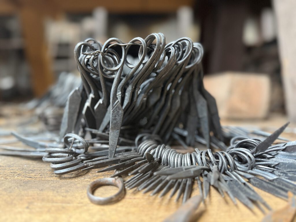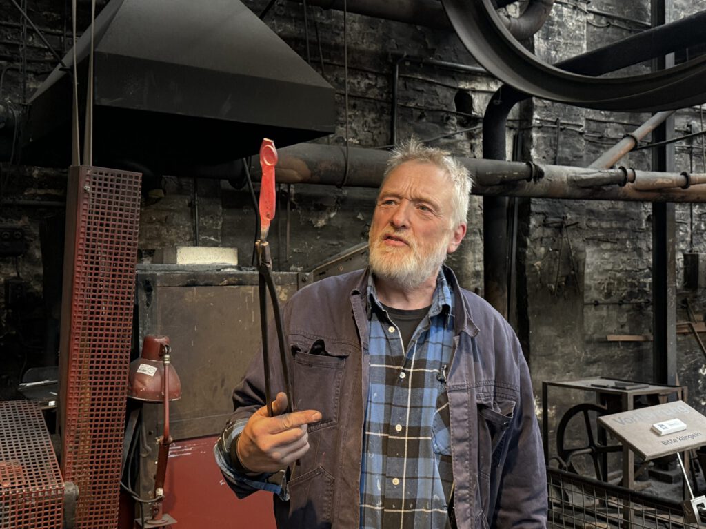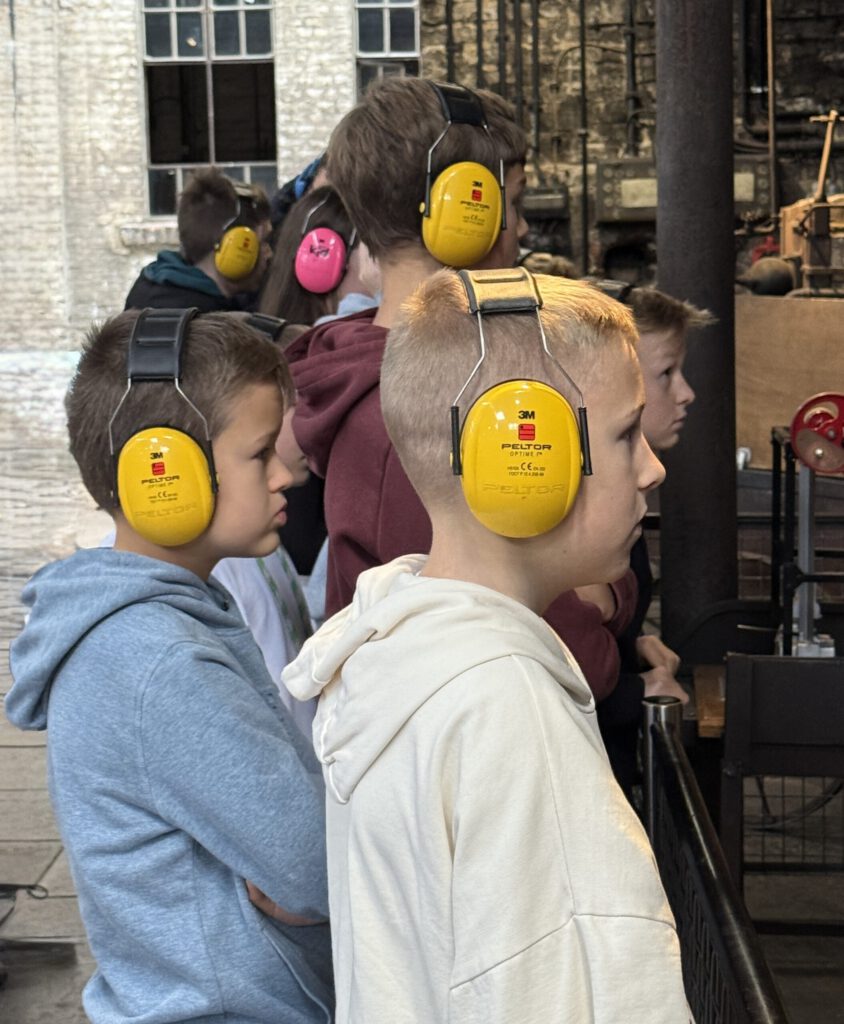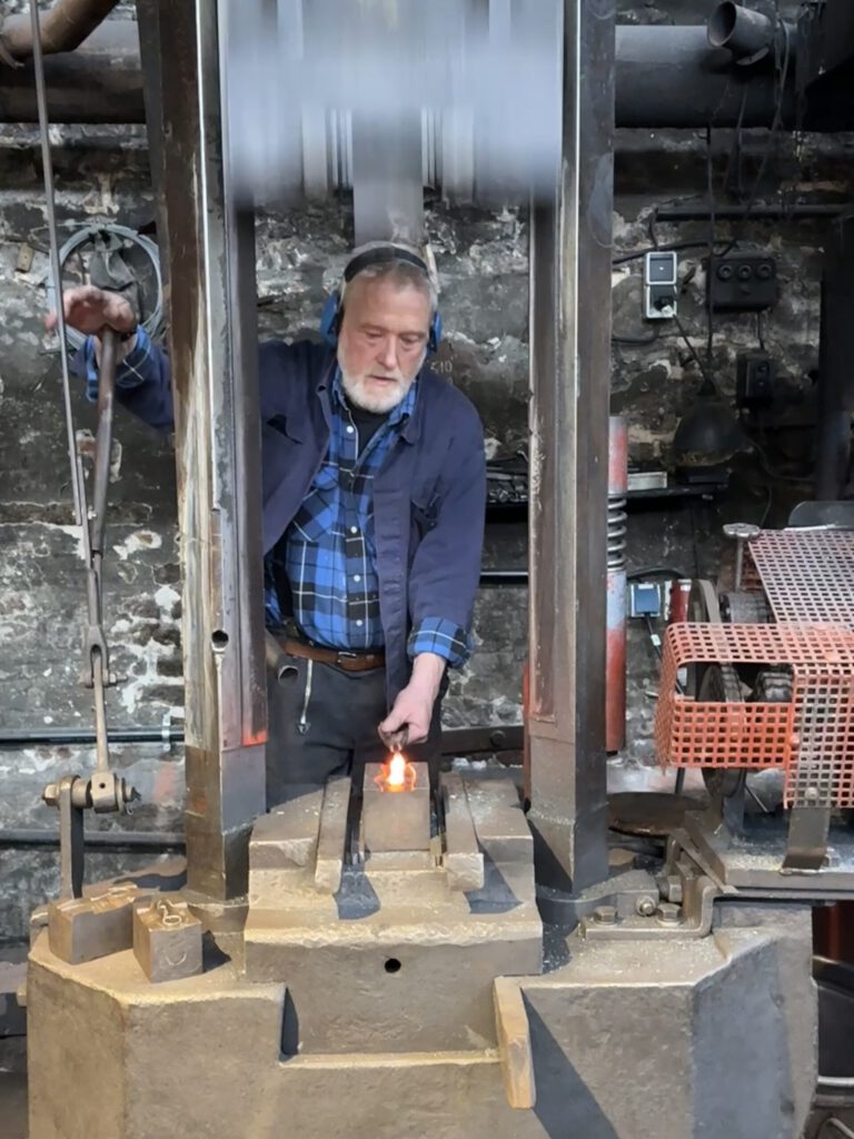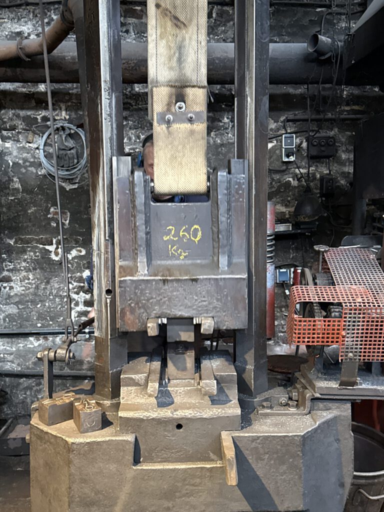 „Der Riemenfallhammer hat eine Wuncht von 260 kg“, erklärt Wolfgang, der ihn ehrenamtlich den Schülerinnen und Schülern eindrucksvoll präsentiert. Für die Demonstration des Hammers haben sich alle Zuschauer Gehörschutz aufgesetzt, weil sein Knall so laut ist. „Ihr seht, jetzt haben wir das eine Teil der Schere geschmiedet, das nun noch 700 Grad hat. Das muss abkühlen, während wir jetzt das Gesenk für das gegengleiche Teil nehmen und es schmieden“, erzählt er weiter.