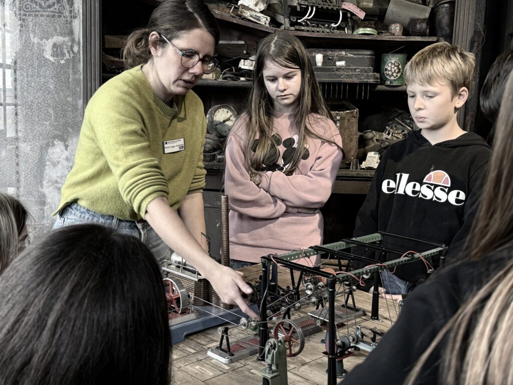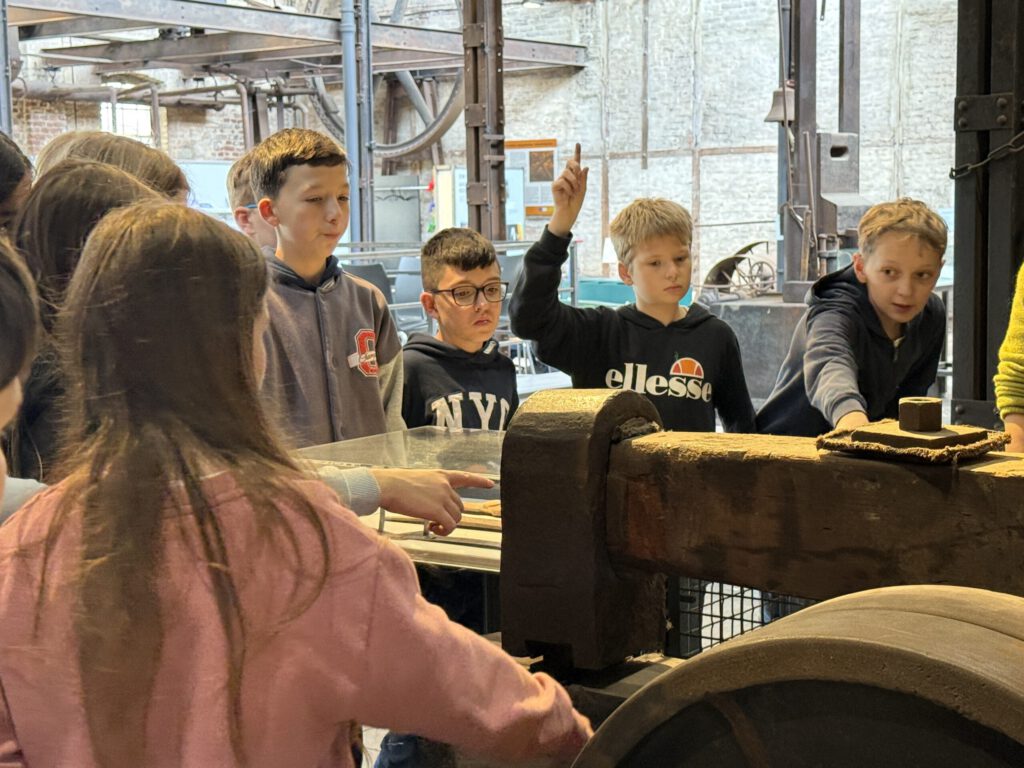 Neben dem aktiven handwerklichen Arbeiten hatten die Schülerinnen und Schüler zudem die Gelegenheit sich die einzelnen Hämmer anzusehen. Mit dem Bockhammer durften sie sogar kleine Prägungen erstellen. Und kleine Maschinenmodelle zeigten ihnen, durch welche Kraft, die Maschinen, die für die Herstellung nötig waren, aufgebaut waren und wie sie funktionierten. „Ich fand das Modell total interessant, das gezeigt hat, was früher die Dampfmaschinen alles angetrieben haben“, berichtet Lutz.