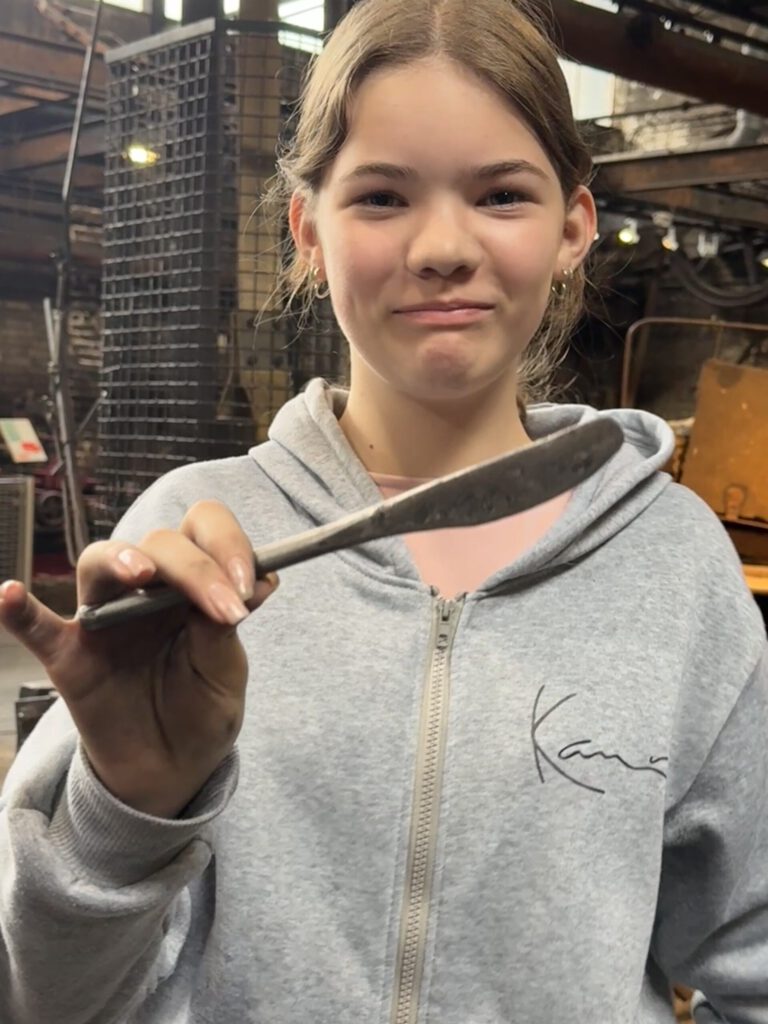 Allen Schülerinnen und Schülern ist eindringlich deutlich geworden, dass das Arbeiten in der Gesenkschmiede sehr beschwerlich gewesen sein muss. Außerdem haben sie einen Einblick in technische Verfahrensweisen von Maschinen und in handwerkliche Tätigkeiten bekommen. Sie konnten sich in einer Weise erproben, für die im schulischen Raum wenig Möglichkeit besteht und sind alle mit einem eigen hergestellten Messer und voller neuer bereichenderer Erfahrungen vom Ausflug wiedergekommen.
