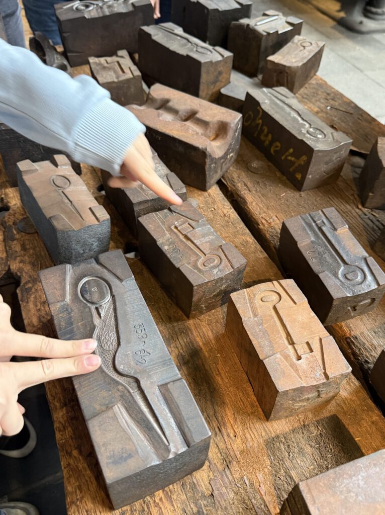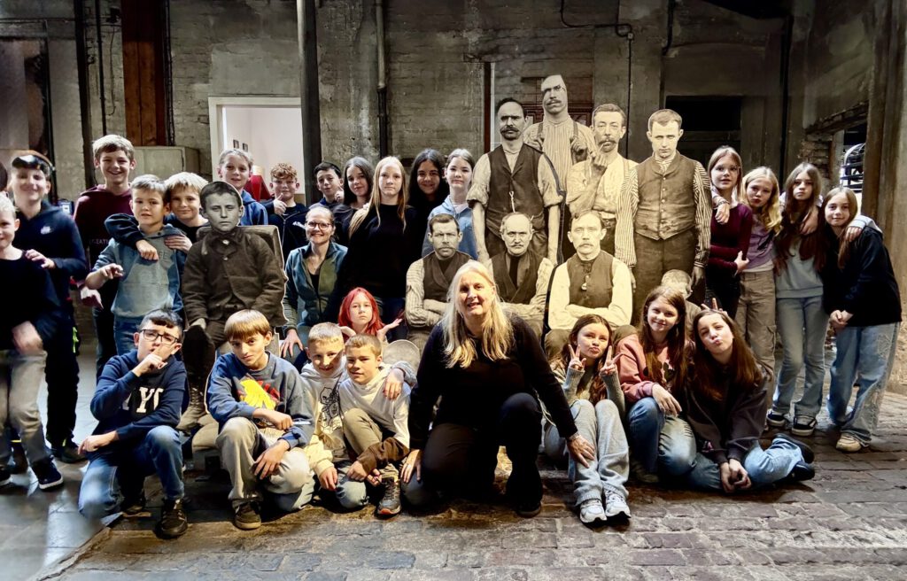 Zum Schluss wurden noch die Arbeitspritschen der Arbeiter betrachtet und die unterschiedlichen Scherenrohlinge bestaunt. Die Arbeiter, die früher auch in Regalen schliefen, waren als Aufstellfiguren anwesend. Sie standen der Klasse 6b für ein Klassenfoto zur Verfügung.